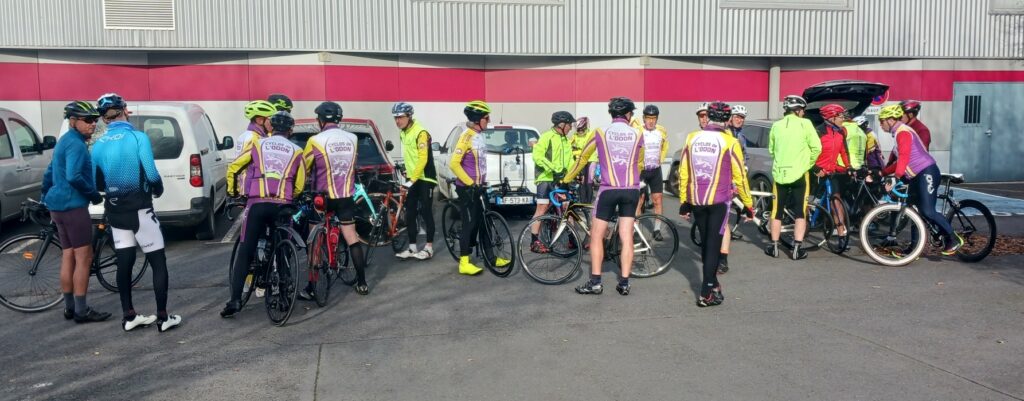 26 cyclos au départ : Jean-Marie, Bruno, Georges, Gino, Joël C., Ghislaine, Serge, Joël Go., Jean-François G., François, Michel, Joseph, Bernard, Rémi, Yvette, Jacques, Martial, Pascal M., Philippe M., Gérard P., Patrice, Didier R., Yves, Marcel, Pierrot et Alain.